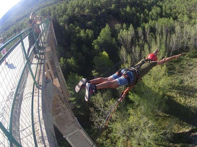 También llamado bungee jumping, es una actividad en la cual una persona se lanza desde una altura elevada, con uno de los puntos de la cuerda elástica atada al torso o al tobillo, y el otro extremo sujetado al punto de partida del salto.